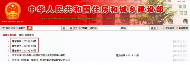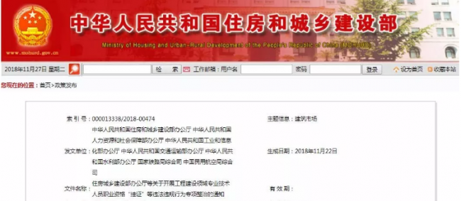 2018年11月22日,住房和城乡建设部办公厅、人力资源和社会保障部办公厅、交通运输部办公厅等七部门联合下发了《关于开展工程建设领域专业技术人员职业资格“挂证”等违法违规行为专项整治的通知》。