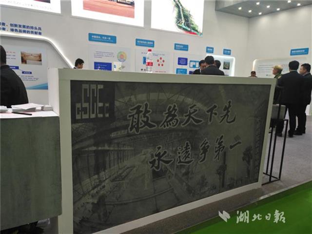 中建三局绿投公司展厅,通过模具生产出来的水泥板上,印有“敢为天下先永远争第一”10个字。