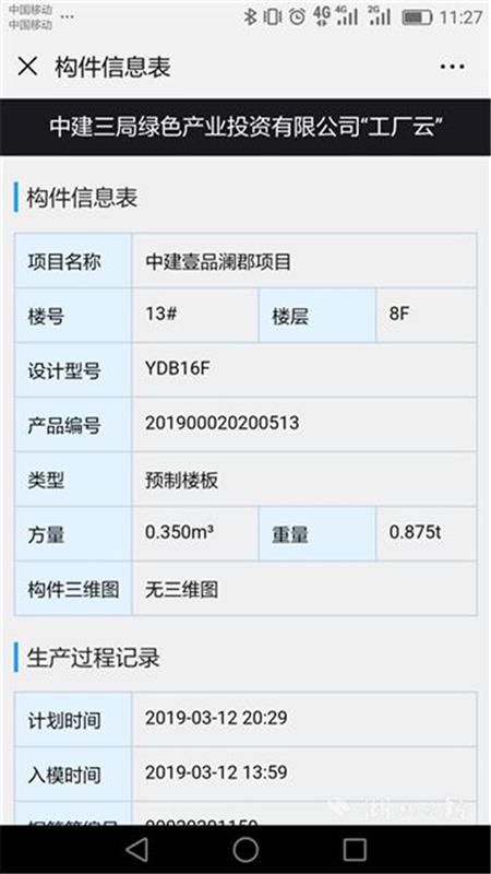湖北日报全媒记者现场用手机扫码,跳出的页面详细显示构件信息和生产记录:所在项目“中建壹品澜郡”,楼栋13号,楼层8楼,设计型号YDB16F,产品编号201900020200513,方量0.35立方米,重量0.875吨,无三维图,入模时间2019年3月12日13时59分,钢筋笼编号00020201159……