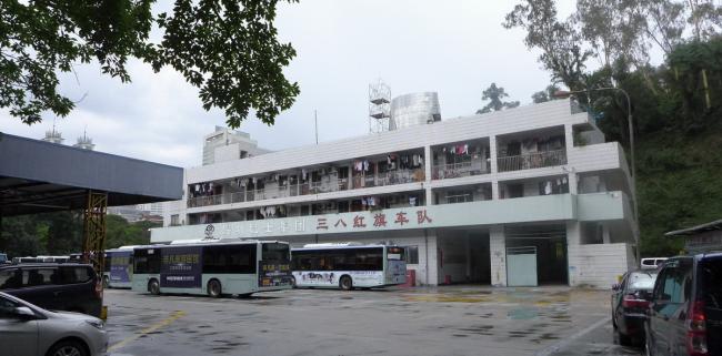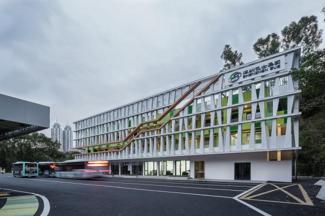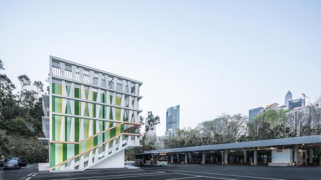 莲花山公交总站项目位于深圳福田区莲花山的西南角,新洲路与红荔路的交汇处。使用者是公交集团的三八红旗车队。改造前的建筑是三层高的瓷砖外墙的老房子,一层是办公,二层和三层是宿舍。陈旧的建筑设施与形象满足不了内部使用、对外交流和宣传的需求,于是公交集团决定通过整体建筑和环境的改造,以及把二层和三层的宿舍转化为党群中心和办公,为车队提供一个舒适的办公场所,也为市民提供优美的候车环境和优质的服务。