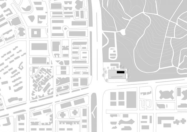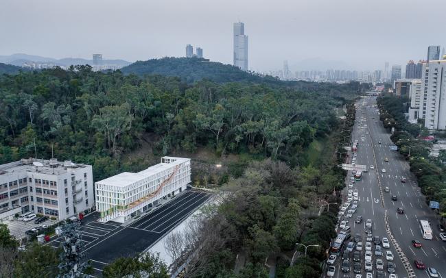 项目地块周边的两条主干道都设有绿化带和高大的树木,地块的另外两边紧靠莲花山。建筑处在一片绿色环境包围之中。因此整个改造希望让建筑呈现轻巧的姿态并与周边环境互相融合。