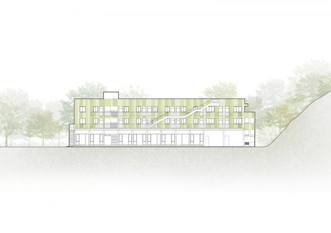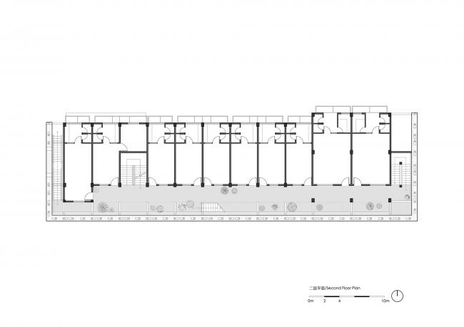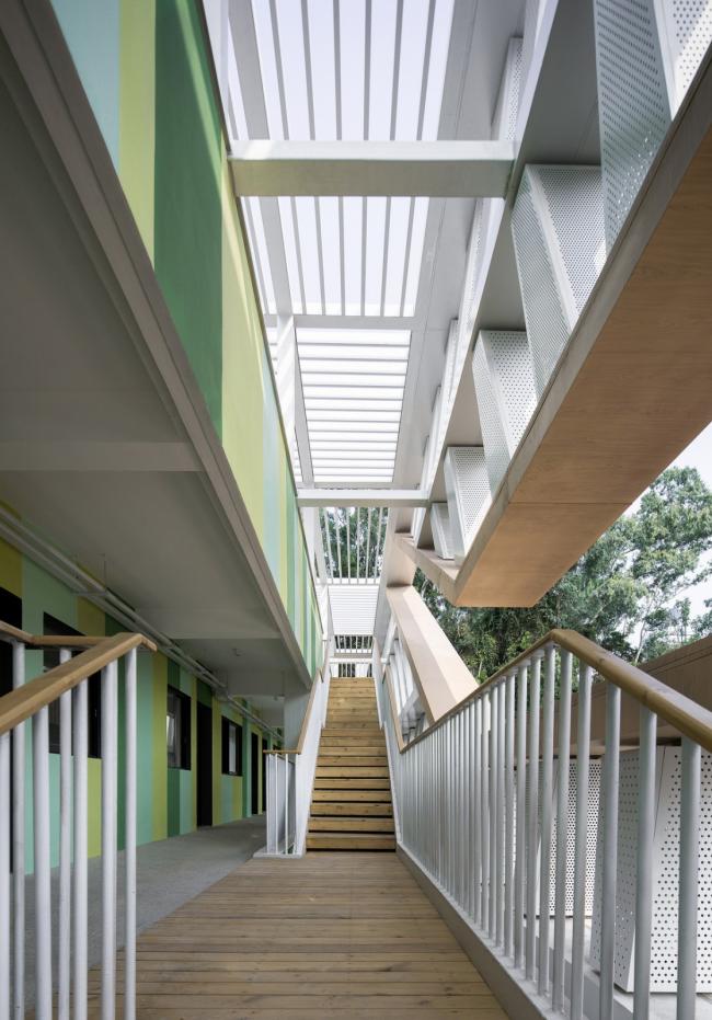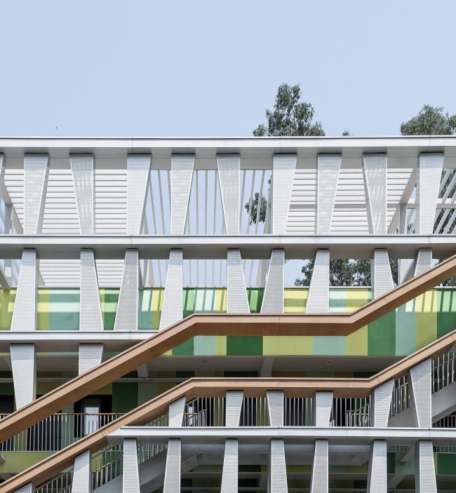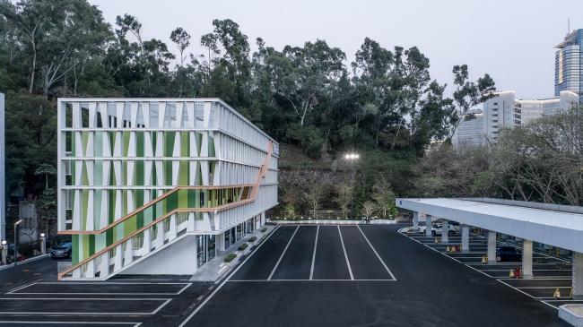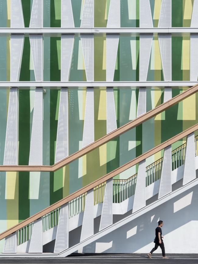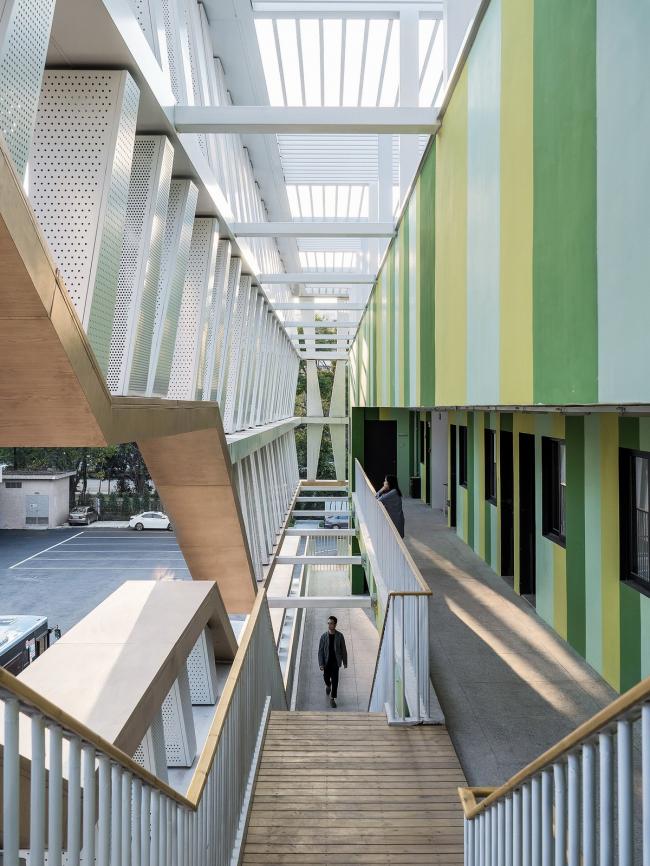 另一方面,原有的二层和三层的瓷砖墙翻新成涂料墙,四种绿色形成的丰富条形图案与周边的绿树相得益彰。而白色的幕墙立面让建筑保持谦逊的姿态的同时,内侧的绿色外墙透过幕墙若隐若现。正面观看建筑时,绿色内墙最大限度呈现出来,建筑表现内敛的绿色外观。随着观看角度变斜,立体的梯形体逐渐遮挡更多的绿色内墙,建筑的绿色外观变得灵动,而不是呆板直白的形式。另外,原有建筑的二层室外平台比三层室外平台要宽,新加的幕墙表皮与原有建筑外墙之间便形成了一个室外的围合空间,成为积极的室外交流场所。