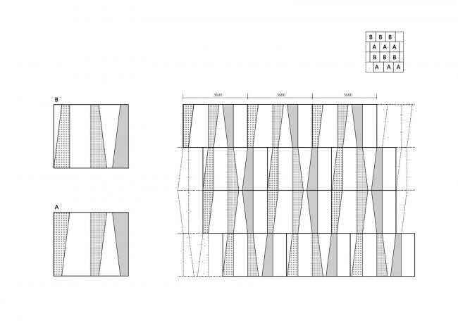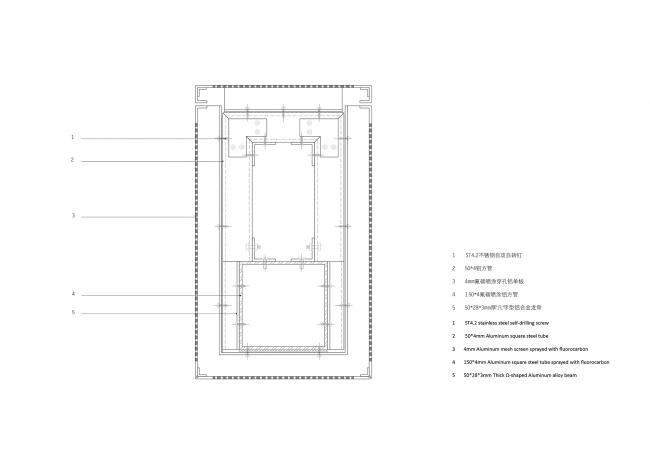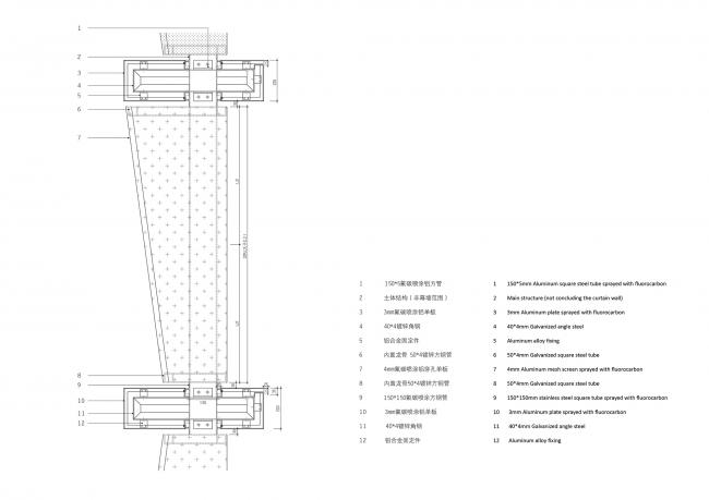 为了保持原有形态,建筑的三个主要立面以及屋顶增加了新的幕墙表皮。新的幕墙表皮不是封闭的,而是开放和立体的。根据原有建筑梁的位置,新的幕墙分为四层,每一层靠原有结构出挑钢梁支撑,并且每隔3.6米设置竖向钢柱,使得加建的幕墙形成稳定的结构框架。新幕墙的每一层分布了若干个变截面的梯形体,而每个梯形体由一块“U”型穿孔铝板和另一块平整的穿孔铝板组合而成。每一层的梯形体在竖向连成一体,并齐平立面的外侧,竖向钢柱也因此可以隐藏在这连续的梯形体里。梯形体有三种穿孔率,通过单元组合,在立面形成了丰富而有韵律变化的幕墙体系。在构造方面,这些梯形体都是工厂预制件,在施工现场工人利用铝板的孔洞把梯形体固定在其内部的结构支架上,避免了固定构件外露而影响外观。