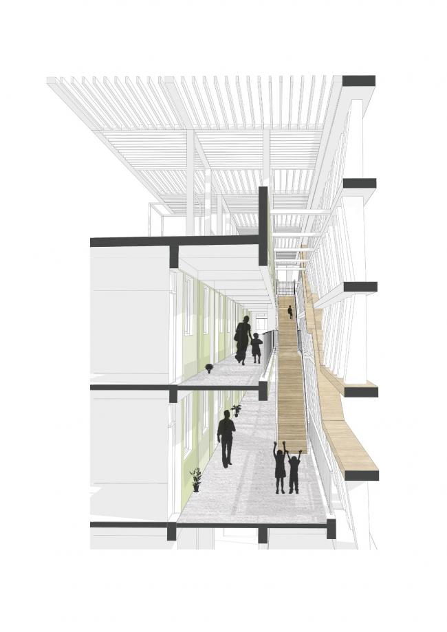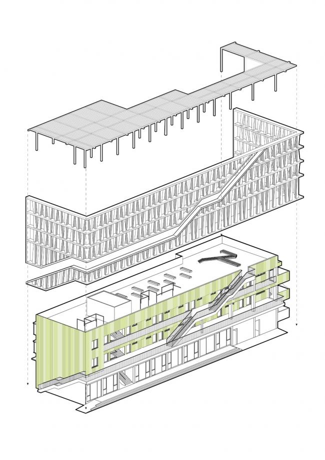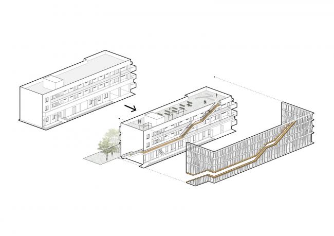 除此之外,设计在建筑里引入一条公共流线,通过楼梯串联了一层北面食堂出口、二层、三层和屋顶空间,使不同标高的交流场所建立更紧密的联系。新加的幕墙表皮也形成一条长条形开口对应着这条公共流线,使得内部空间与外立面形式统一。人在行走过程中也能透过开阔的开口观看外部的绿树与城市。
