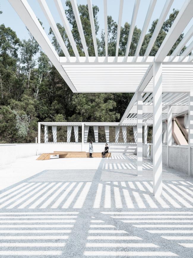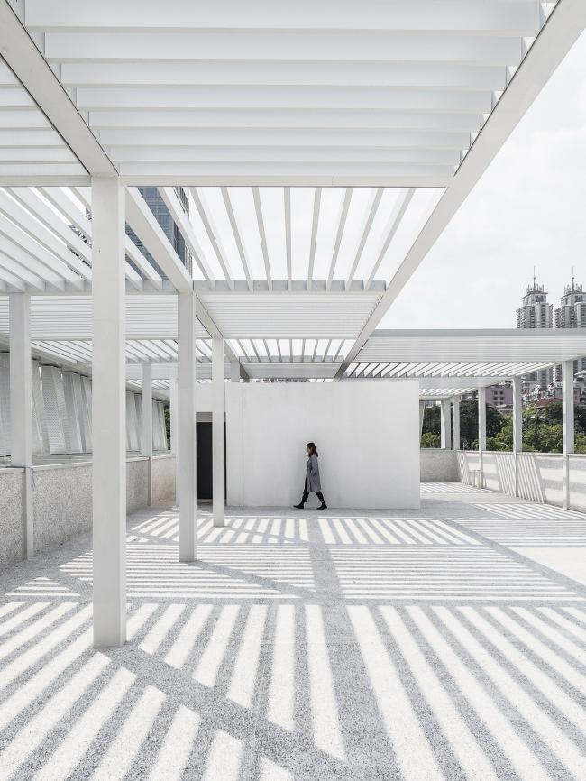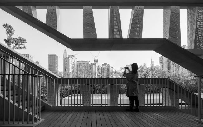 格栅覆盖了大部分屋顶空间,除了具有遮阳作用,还与立面的幕墙形成一个完整结构系统,力学更优、更稳定。在靠山一侧,留出的开敞空间成为与自然相接触的花园。这个半开敞的屋顶空间容纳了丰富的活动:种植农作物、开室外派对和观看福田中心区城市夜景。