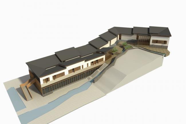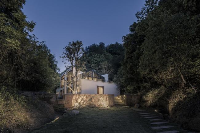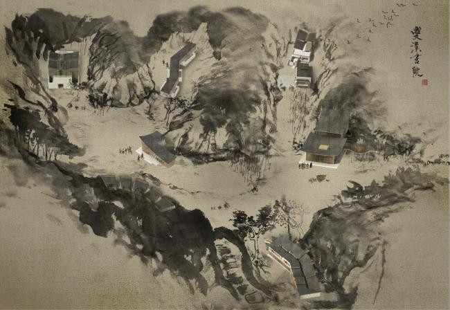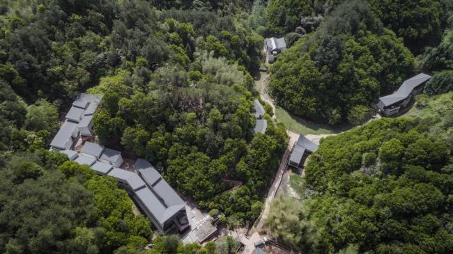 这一诗意的诉求使建筑设计在一开始就被赋予了一种明确的画面感。一方面,如何让建筑真正的融入环境,从而加强这种场景感而不会破坏它,成为前期“规划”的一条基本准则。说是规划,实则更像一种随地形变化的自然的“安排”——几条枝杈状的11-14米宽的溪谷向不同的方向蜿蜒,建筑就被契入山谷之中,只呈现出谷口的一个立面。于是,双溪书院的七个单体建筑,除了接待大堂(也做餐厅)和茶室两个公共功能的建筑外,都被分别隐藏在四条张开的山谷内,互不相望,各自以各自独特的视角存在,这种关系有些像传统山水画中的散点透视,每个局部自成一体,又能够“拼贴”成一幅完整的画面。