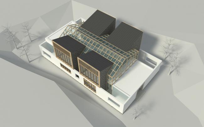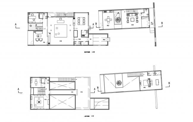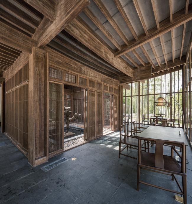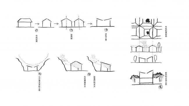 双溪书院的所有建筑单体都几乎全部采用V字形内倾的屋顶形式,这本身也源自平江传统民居院落的剖面关系。这种剖面关系在四分别墅中反映的更为直接。内倾屋面的四个体块成为四个独立的休息空间,体块与外围墙界定的区域即为巷道和公共区域,这种类似聚落的形式也使整个建筑更适应场地,并避免体量过大带来的突兀感。四个独立的功能体块与一个通透的玻璃盒子相互套嵌,产生了居者在室内外不断交互的空间体验;同时,通过围墙的隔挡形成独立的六个小院子,在室内,透过围墙上局部的取景窗洞,使庭院中的人造景观与户外的自然景观形成一个重叠对景的关系。