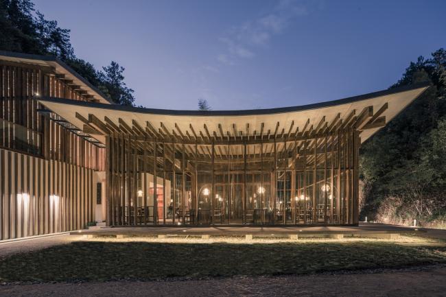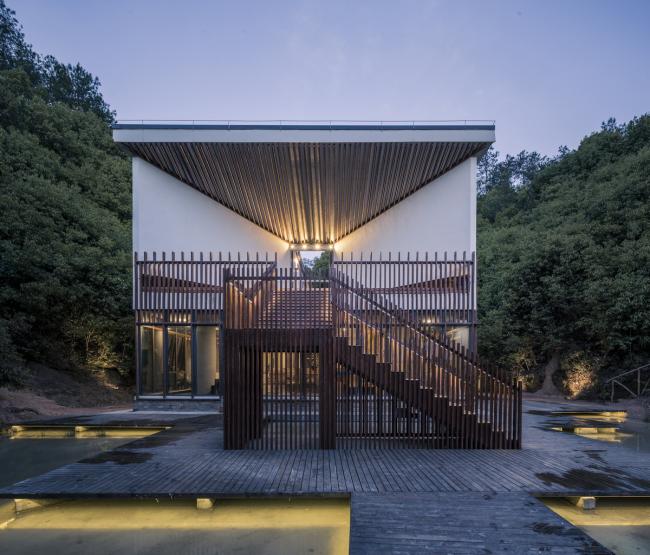 总体上看,这一 86米长的狭长形体随山谷曲折,只在谷口保留了一个完整而突出的立面,依山势而下的溪水在建筑周围汇聚成水面,将入口的立面映射其中,形成安详而静谧的画面。