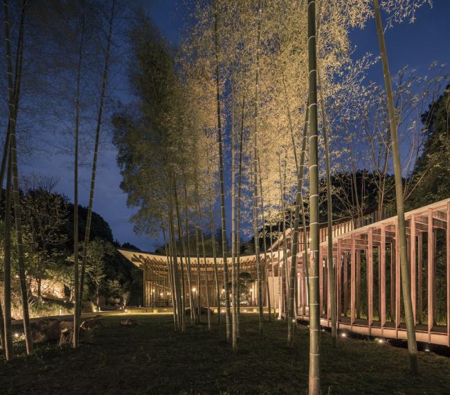 西侧连接接待大堂的部分,是一个几乎完全契入山体的部分,主要布置了厨房、餐厅包间、小展厅等辅助功能。一个巨大的单坡屋顶顺山势倾斜,与接待大堂的屋顶形成叠落的关系。为了达到更轻薄的形体效果,建筑主体采用竹钢搭建,竖向的立柱每根都为承重住,从而达到均匀受力的效果。“柱”与“梁”的连接部分采用简单的交错堆叠起来进行构造的方法,使其在形式上产生出类似斗拱结构的效果。而屋顶则采用GRC预制板,直接“平落”在竹钢框架上;屋顶面层采用金属瓦,而非传统瓦,这些做法都极大的减轻了屋顶重量,使整体结构轻量化,更传达出一种具有现代气质的南方建筑的秀美。
