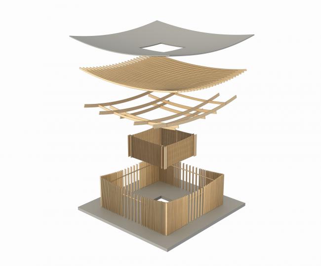 接待堂的设计,顶部是一条向下弧的屋檐线,立面是被概括的竖向的线条。尽管传统建筑的典型的灰瓦的大坡屋顶被取消了,但檐口以下由层层的椽子向立柱传力的基本结构意向还能够表达出和传统结构的一种关系。其他侧立面则是正立面的直接复制,最终形成一个围绕“天井”的正方形布局。总体形态上,这个“回”字形的结构是启发自传统平江地区的民居内天井的布局形态的。接待堂向四周翘起的屋檐是对周边天际线的最好呼应,也为室内带来更好的光线和更通透的观景效果。