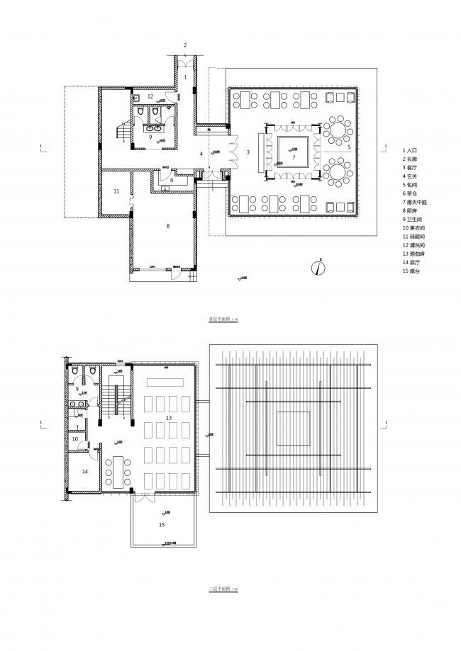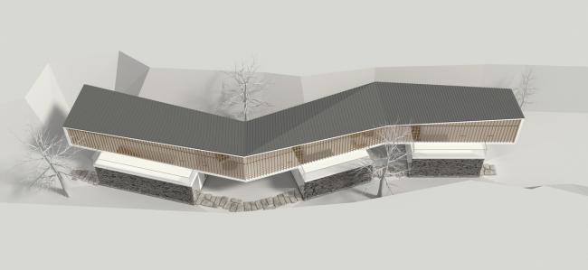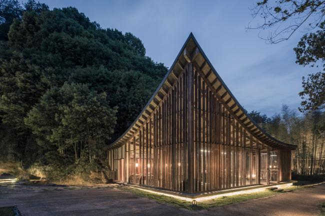这栋建筑在形态上与山谷客房有着相似之处,即都是迎着谷口的端头立面作为建筑的主立面,而主要的体量则隐匿在谷中。建筑随着山谷地形走势呈现折线关系布置,一层有三个独立的单体“盒子”,主要为公共活动空间,穿插其间的是几处半户外的“亭子”空间。这些空间由一条边廊连接。二层为卧室等私密空间,成线状排布成一条通长的“廊桥”结构,连续的竹钢格栅立面增加了“廊桥”在结构视觉上的整体性。在实际的功能划分上,多数使用状态下二层的卧室等私密功能是独立分割的;只在必要时可以通过二层的走道相连接。屋面三角的折面关系使整体形态更相似与传统坡屋顶的意向。