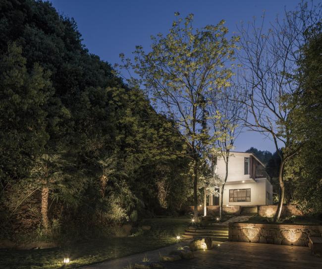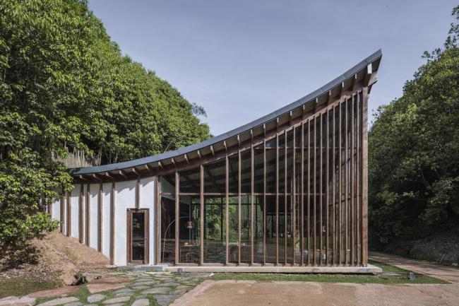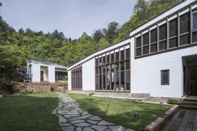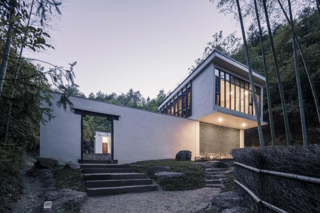书院与先生房位于西侧的谷内,隐藏在一片茂密的竹林之后。随坡而上,一侧是小溪,一侧是茂密的竹林。路尽头是书院的入口大门,位于白色院墙左侧,这和右侧越过白墙挑出的休息室共同形成均衡的构图关系。进入大门,U形的庭院才清晰可见:庭院被台地分成两级,连接两个单体,错落的空间关系形成了更丰富的景观体验。建筑看似由两栋独立的单体构成,但通过相同的结构和材质,使两者之间形成一种整体的关联。书院建筑的屋顶从两侧向内倾斜,并由远及近逐层错落,形成与周边山势轮廓相呼应的轮廓,应对与周边的景观关系。