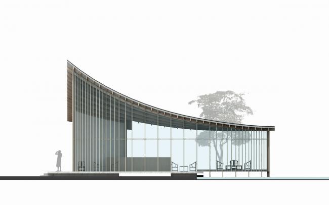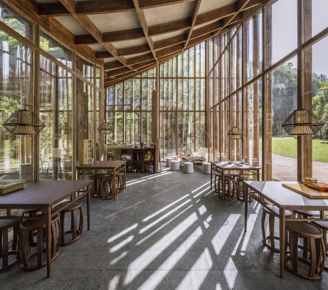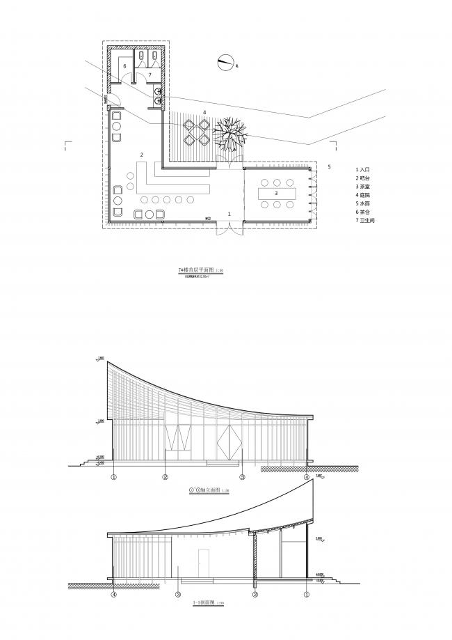 茶室东侧立面在布局上与接待堂东侧立面形成一条轴线,以求得在主要视点透视线上的连贯性。茶室的总面积为109平方米,是一个“L”形的半围合院落,一端契入山体,另一端延伸并挑出到池塘上空。转折处的屋角约8米高,指向东南向的天空。这个“屋角”成为三条山谷会合处的空场的标识物,也成为和接待堂呼应的轴线上的制高点。屋面连续向两端陡降,形成一个狭长的内斜屋顶。立面通高的玻璃幕墙不仅带来了更宽阔的视觉体验,还给室内提供了充足的自然光线。