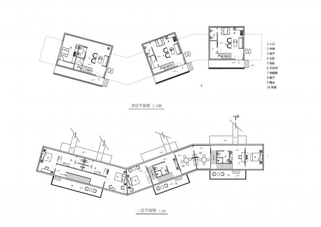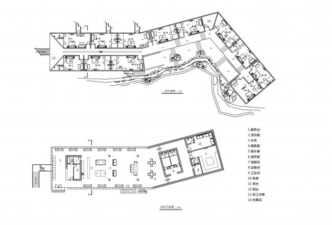 一层在结构上成为底部架空的附属空间,主要设置为多功能的休闲大厅,咖啡、水吧,以及一个小型会议室,并且一层三分之二的面积是埋入山体之中的。一层在交通组织上和二层是分别设置的,而所有的客房均位于二层,需通过主入口的景观楼梯单独进入二层小巷,这样是二层的客房区相对安静独立。18间客房即沿着小巷分布两侧。