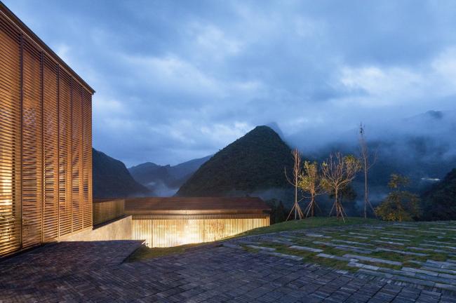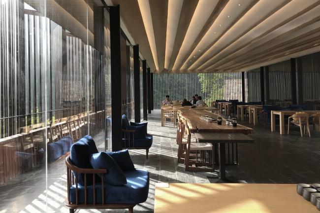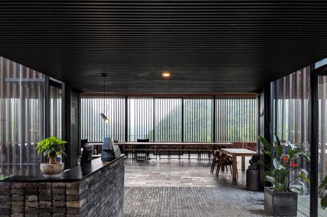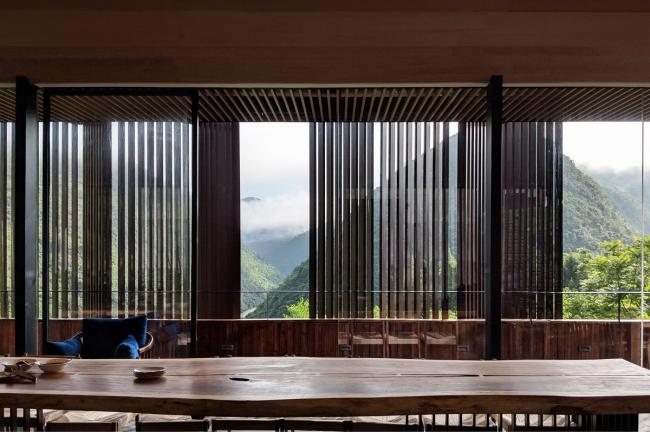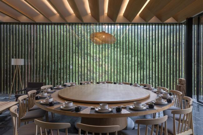 入口厅位于较低标高的餐厅层。餐厅外立面采用玻璃与竖向百叶结合的方式,外部形成简洁的(BIM工作)体量,内部则引入柔和的自然光线,同时保留置身于山景之中的通透感。在面向山谷一侧,设置了通长的半室外走廊;走廊外侧的竖向百叶可调节开启,巍然厚重的山体和山间的云雾尽收眼底,使就餐环境随着天气、季节的变化产生不同的氛围。