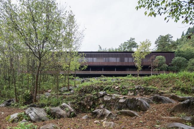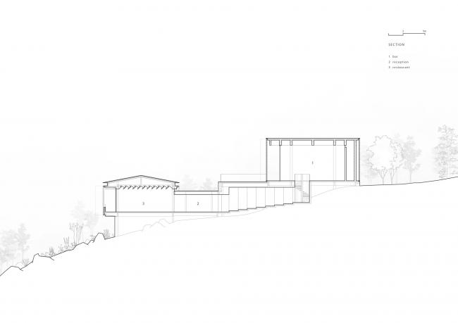 项目场地位于高差很大的陡坡上,背靠竹林,面向河谷和群山。因此我们在入口标高设置酒吧,餐厅则沿山坡设置在低处。错落的布局能够弱化建筑体在环境中的体量感,保留邻近的篝火广(BIM学习)场的开阔视野,同时使餐厅及酒吧互不遮挡,室内空间都能够获得良好的景观。两个主体量的外立面采用相似但有区别的设计,深色的立面材质使建筑体量与周围的自然景观相融合。