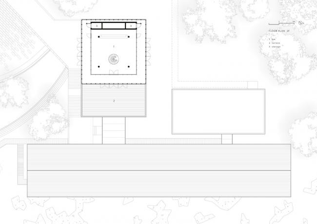 酒吧与入口厅由一个旋转楼梯相连。酒吧体量约6m高,尺度与后方竹林相协调,整体结构采用四根钢柱支撑。酒吧采用双层立面,在玻璃隔断之外保留连廊空间,最外层采用可开启百叶门扇,在需要时可向景观面敞开,与外部的广场、露台相连通,将室内的休闲空间向室外延伸。