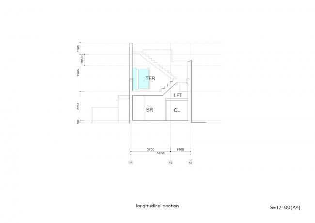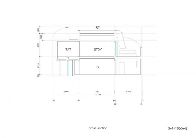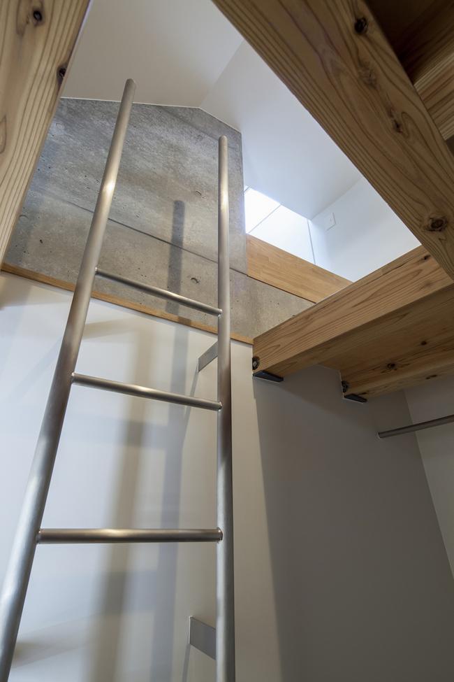 在首层的卧室后方的阁楼的夹层中,有着一道小(BIM教程)门,它看上去就像从入口爬进茶会小屋一般。通过这里,我们可以到达二层,其功能是作为制作音响设备和其他东西的工作空间。这如同以前一样,是一条消极的人流动线,与楼梯创造的从入口大厅到三角形天窗的主要流线相反。上下两条流线带来的结果就是,住户的日常空间和不常用空间被绑定在一起,如同莫比乌斯环一样,一个从中部穿越整个房屋的核心流线得以产生。