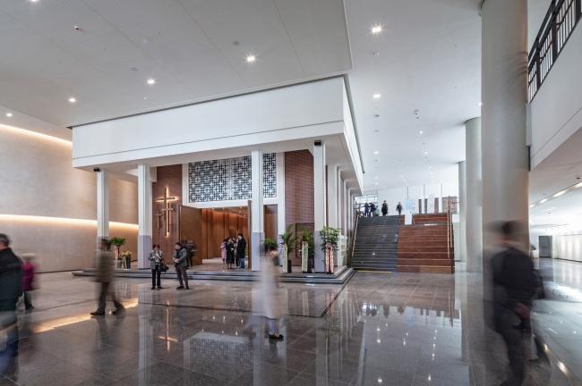 而设计师“爱邻里街坊”的概念,则可以通过教堂的外形,直观地被人们感受到。而这,也似乎是21世纪教堂设计中,所要深入考量的一点。此外,由弯曲拱门和内凹前檐所围合的 Saemunan-ro 庭院,旨在成为一个面向邻里开放的市民休憩区,而非修道院般封闭的祷告空间。而这样的一种空间形式,在全球范围内都未尝有过。同时,教堂的前厅,还与用于艺术表演的世宗文化会馆(Sejong Center),有着一定的空间连续性。这在一定程度上,也体现了该教堂的开放与包容。而体量较小的教堂,也会基于现有的砖砌教堂,通过比例缩放的形式,进行建造,以供公共文化空间所需。