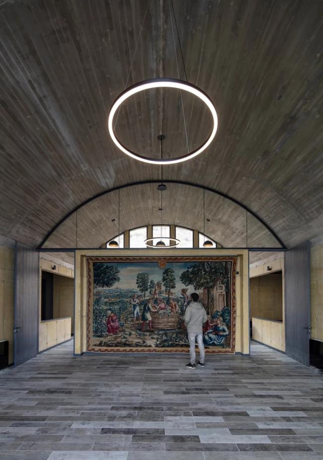 根据客户的要求,中央空间应该放置一块高3.6米、宽6米的大型意大利挂毯,一方面决定了它的支撑结构——墙,另一方面是能使它更好呈现的反映距离、高度以及包络关系的——天空。在查看了几种平屋顶和倾斜屋顶的可选方案后,MAPAA建筑事务所选择了一种无支撑的屋顶。因此,一个能够覆盖很长距离而不倾斜并且释放横向支撑力——也即将两个办公室与中心空间分开的墙壁的拱顶的想法,似乎是理想的。