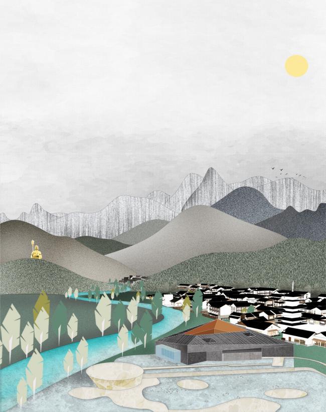 正清和雅禅院是莲花小镇的第一个建筑,也是小镇的村口。“一棵树、一口井、一只打鸣的公鸡”这是中国人脑海中的“村口”画面,也是思乡情愫中强烈的暗示。我们给予小镇的是充分的广场、广阔的水面、一口钟和那棵树。