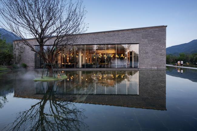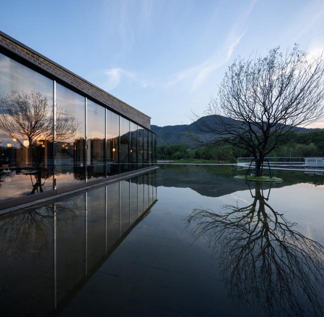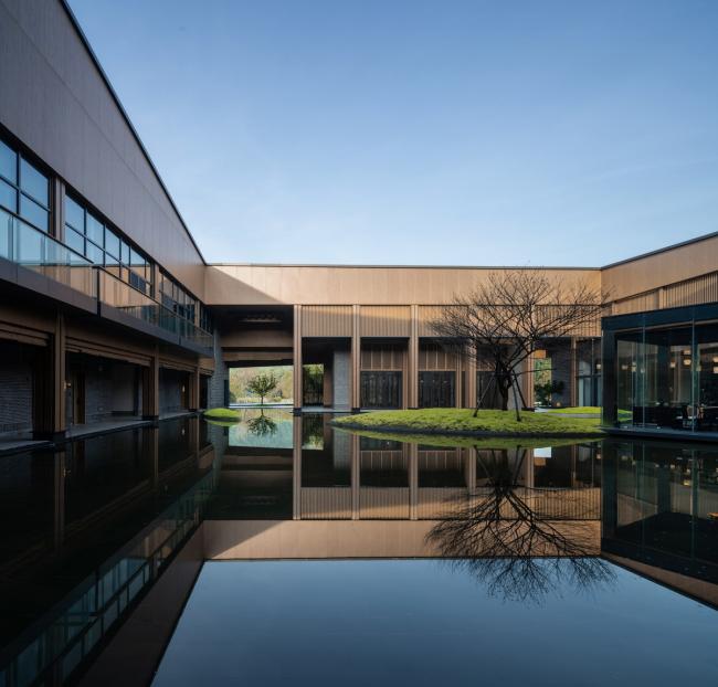 建筑并没有选择碎片的方式来消隐在自然之中,而是以完整的形态放置于水面上,似将四时之景纳入院中,又似院中岁月溢出山水天地,空间由人所创,禅境由心而生。