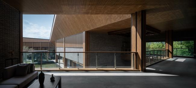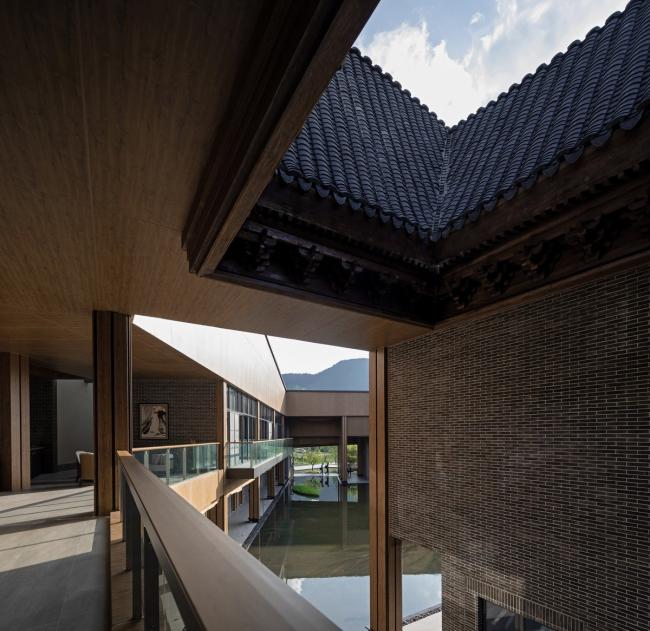 内(BIM工程师)院则采用大量的木色铝板和玻璃,在阳光的作用下格外温暖。内外的材质在檐口之下进行过渡,吊顶的木色延伸至室外,倒影于水中,灰砖则转入走廊及小院四周,流动与延伸是空间的主题。