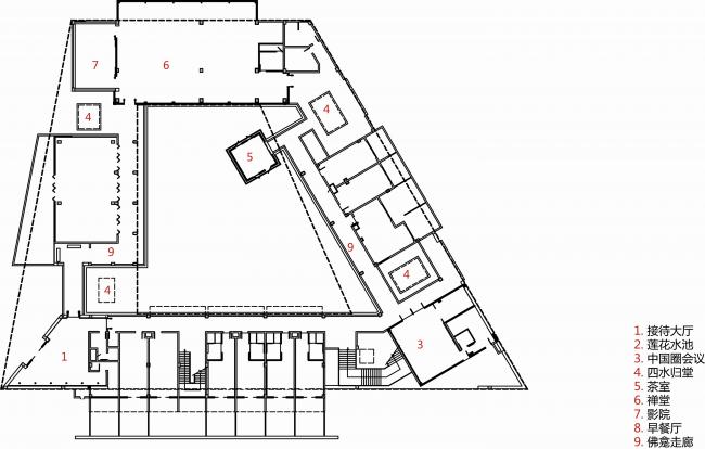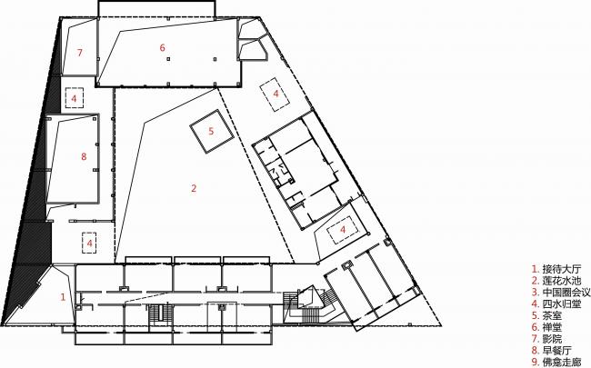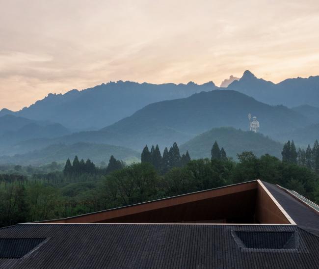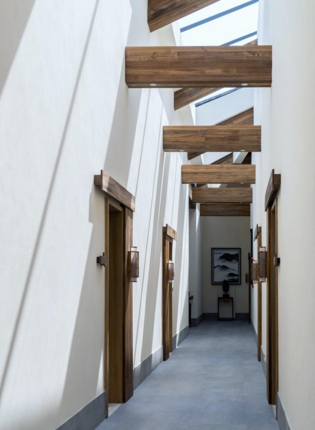 建筑的基本功能是一个酒店,房间设置在南面及东面,可望山敬佛。二层的部分,将房间横向布置,从而产生了一条内走道,天窗也自然而然出现,顶部的采光延伸到楼梯的位置,形成方形矩形若干窗井,随着光线的变化,这是一个意外生动的空间。