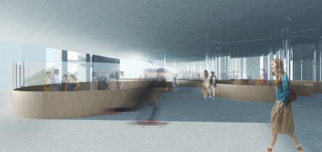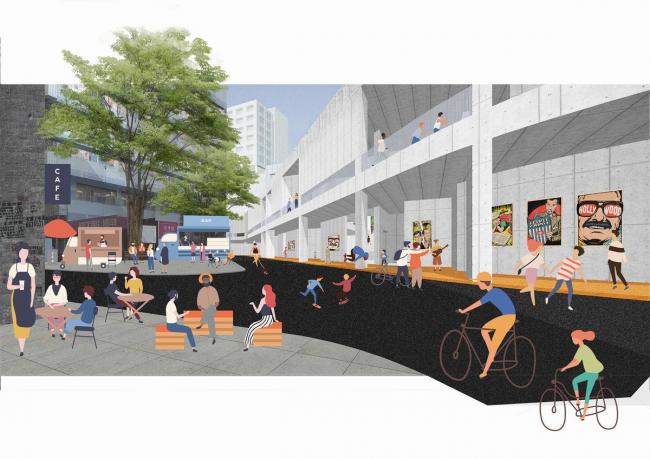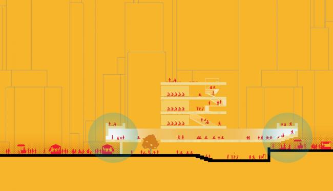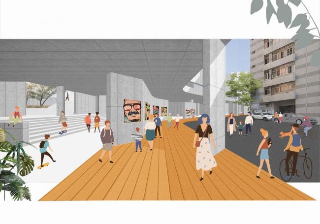 以岭南传统的骑楼空间构成一个有厚度和进深的界面。沿校园红线形成一个校园和城市之间的环状带形空间,一个连续开放的多孔体,为社区和校园提供一个休闲和相互展示的公共交流空间,也创造了“零退线”的可能。由于地形存在一定的高差,骑楼下的空间也随之起伏变化,结合校史展览、科学普及等展示功能,成为人行道的拓展,城市街道空间的延伸。骑楼的楼板拓展了校园功能空间,成为运动场的看台和空中步道,也为孩子们提供了一个感知城市和观察社区生活的平台。
