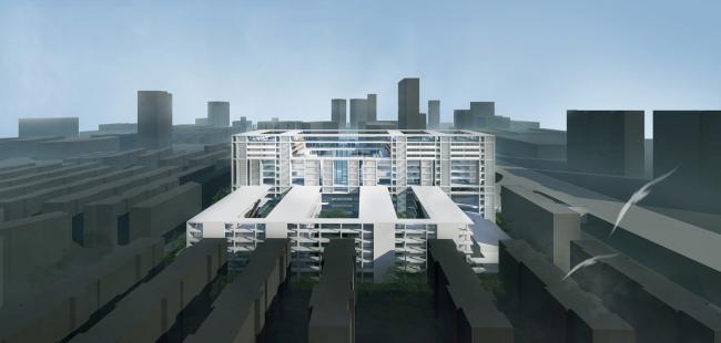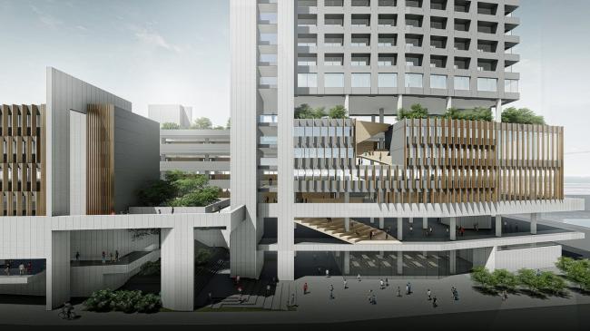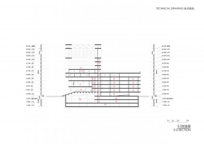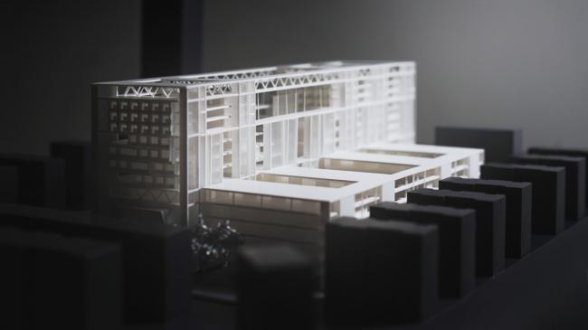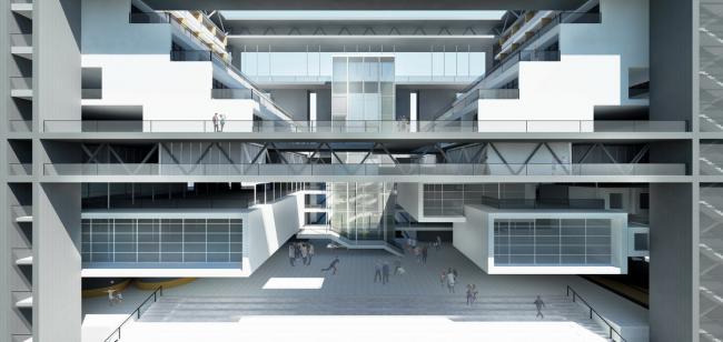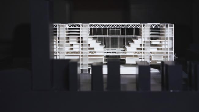 综合大楼采用巨型悬挂结构体系,既解放了局部的建筑空间,满足多变的层高和大面积无柱空间要求,又为建筑在将来的改造和升级预留了充分的可能性。巨型结构在满足建筑结构的不同工况的同时,也表现了一个开放透明的未来生活学习方式的空间范本。我们将这座综合大楼理解为一个高密度城市背景下未来校园的模型,暴露建筑主要承重结构,强调构件交汇处的构造方式,并将桁架作为建筑室内空间表现的元素,表现结构构造和机器美学。