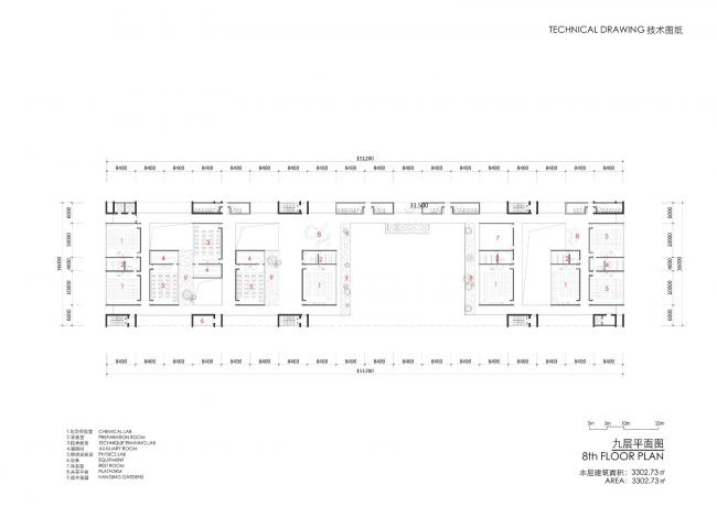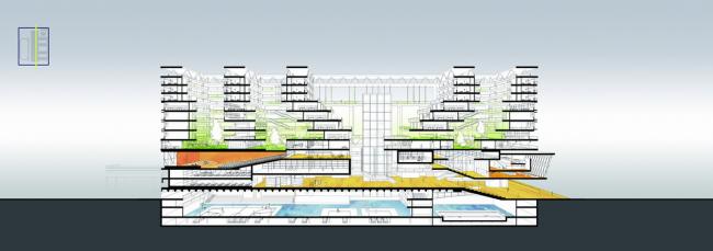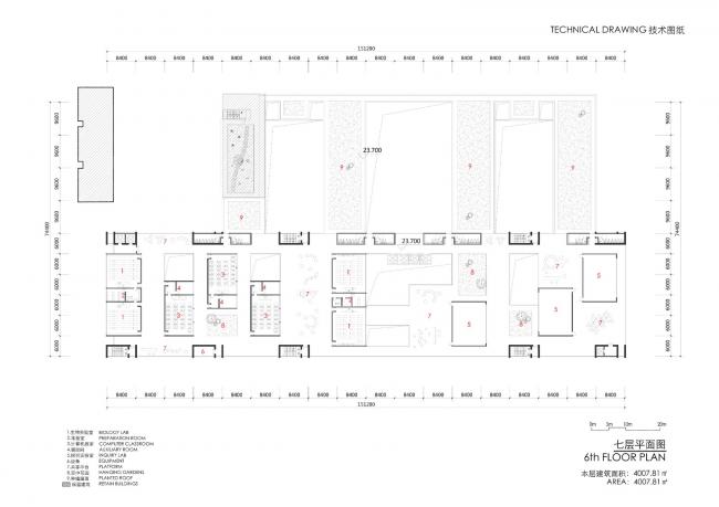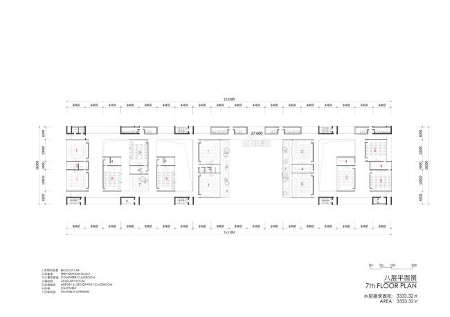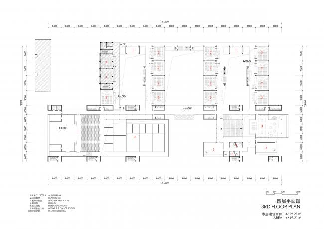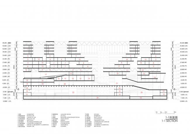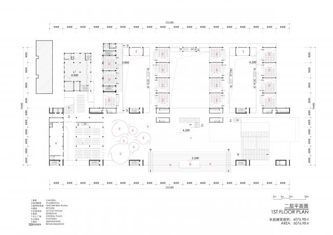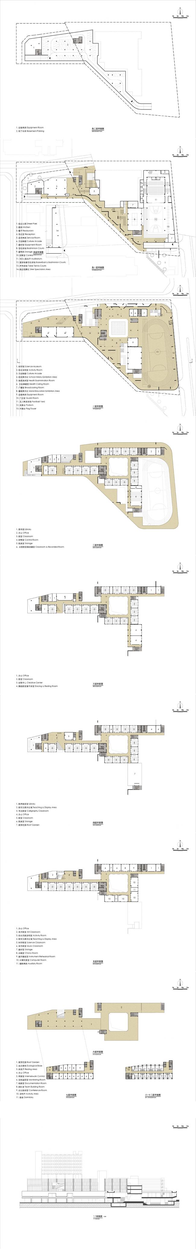 文化骑楼的设置在垂直方向上将校园分成了两个部分:城市共享区与校园核心生活区。这种上下分层的结构使共享区域具备了一定的独立性,方便学校的管理,避免了校园城市共享带来的安全问题。城市共享区位于校园底层,包含食堂、球场、报告厅等功能,周末可对社区开放。校内的各功能用房则聚集在中庭、庭院、运动场等核心空间周围,为师生提供更多的交流机会。2-5层为教学区,其中2-4层主要容纳普通教室,每层两个年级(共14个班),音乐、计算机等公共教学用房主要分布在5层。位于屋顶花园之上的塔楼部分则集中布置了行政办公和教室宿舍,充分改善了教师的办公住宿条件。自此在基本保留了原校舍功能布局的基础上,整个校园形成了多核心多平台的空间格局。