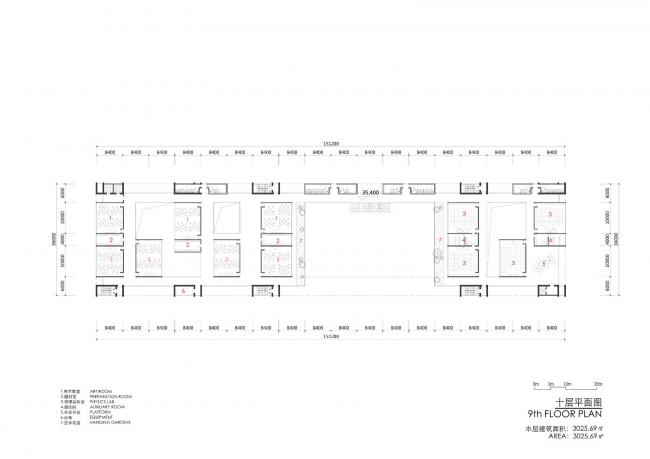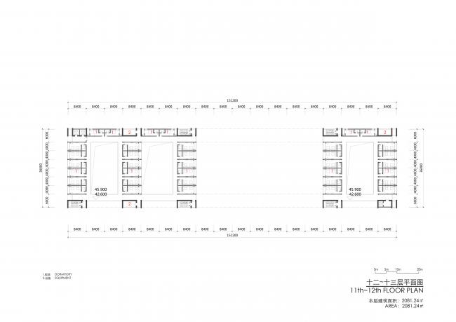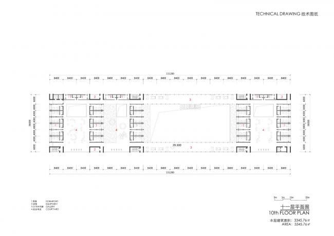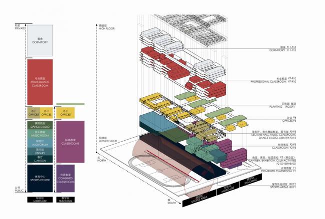综合大楼的功能空间在垂直方向上被划分为三种类型:教学区和宿舍区为规则的柱网空间,报告厅、体育馆为大跨度空间,图书馆、社团活动、展览为流动性强的自由空间。报告厅、体育馆、图书馆等公共活动空间放置在-1~5层;办公区放置在6层;专业教室位于7-10层;宿舍位于11-13层。综合大楼如同一个大型的“书架”,不同高度的“书架隔板”成为了不同主题的“地面”,教学区、宿舍区、公共活动区则是“地面”上3~5层的空间,广场、庭院、戏剧性的公共空间被立体的搁置在“书架”的不同高度,成为每个功能区公共活动的核心。兼顾同一类型功能水平方向的便捷可达,同时也着意展现高层教育综合体带来的特殊空间体验。