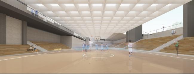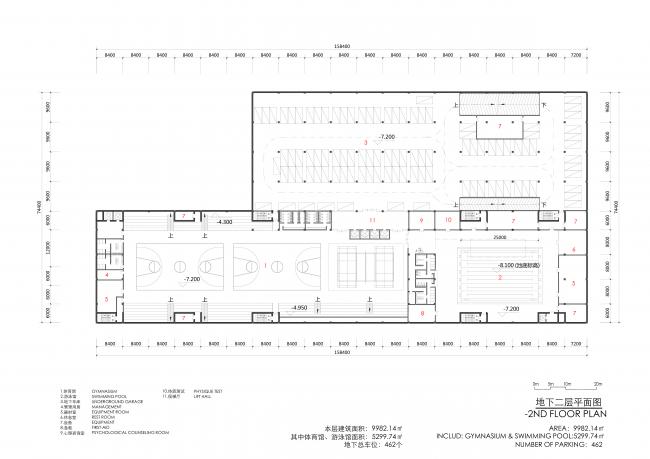 50m高综合大楼立体整合专业教室、办公、会议、运动、午休等功能,同时释放了有限的校园空间,使普通教室构成的教学区能够有良好的日照和间距,运动场得以实土保留。延续现有校园格局,教学区、综合区、运动场由东到西依次展开。教学区结合保留建筑,能够提供60个标准教室,未来可拓展标准教室达72个。地下车库集中设置在建设区,保留的运动场为校园提供开阔的前场,有利于雨水渗透,亦有机会成为未来的拓展用地。