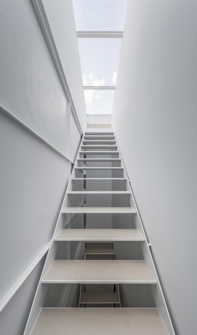 楼梯在平面中起到了主导作用,即使它很窄,它的中央位置仍然让其周围的空间成为使用空间和交通空间。设计团队决定用微型穿孔钢来覆盖这个楼梯,创造透明感,并获得整个房屋的宽度的视觉效果。地面层是专用通道和一个车库。在一层,楼梯与后院提供了自然光线。