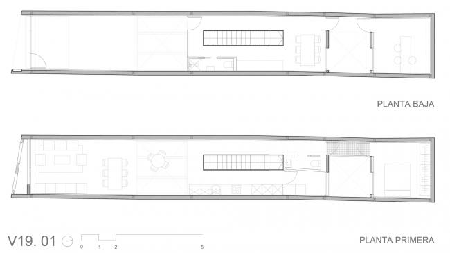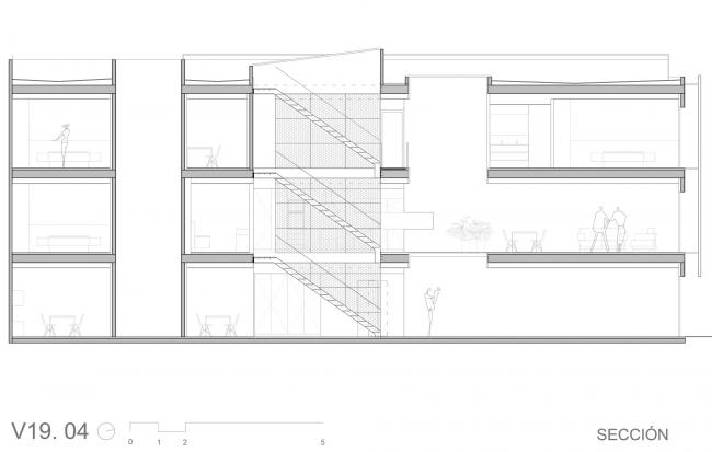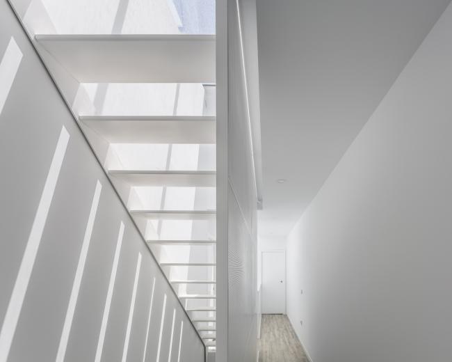 该项目位于在卡斯特伦( Castellón )的老城,在那里,处于非常狭长的地块上的住宅类型是非常常见的。为了实现这个新的项目,设计团队对一个老旧的家庭住宅进行了彻底的拆除。客户关心的问题之一是在房屋的所有楼层都能达到良好的自然采光。这样的结果就是在一个大小为 3.80×24 米的场地中,得到了一个由穿孔的立面将地面层、一层、二层和屋顶覆盖的项目。
