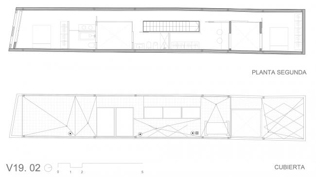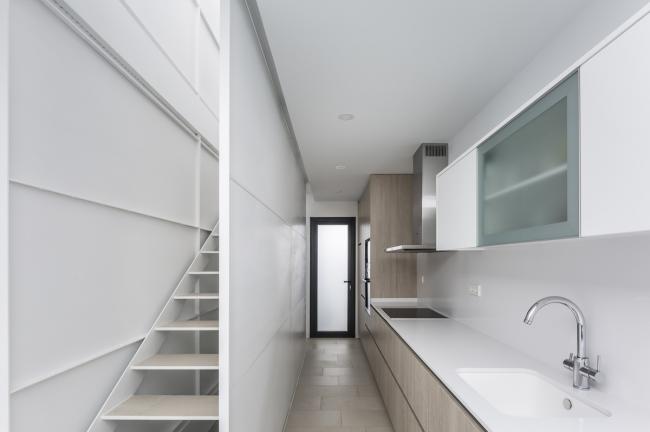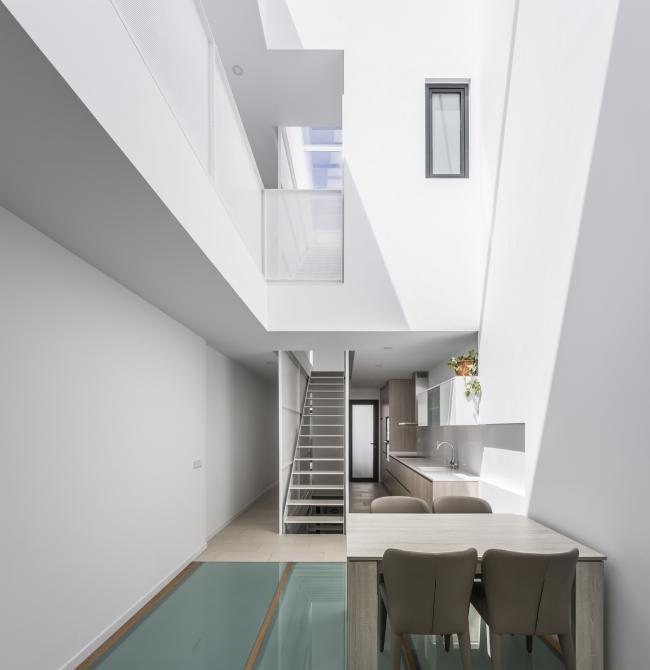 场地的狭窄和对于房屋楼层数量的要求让我们得出了一个解决方案,那就是自然光从屋顶照射进来,因为只有这一个立面是与外界相连的。这个项目的想法是基于两个庭院和楼梯上方的天光,这个天光穿过了屋子的三个楼层,让所有空间都沐浴在自然光线当中。虽然主要的庭院被一个玻璃吊顶覆盖了,它仍然在房子的内部进行了一种外部的处理,以加强与自然光的联系。