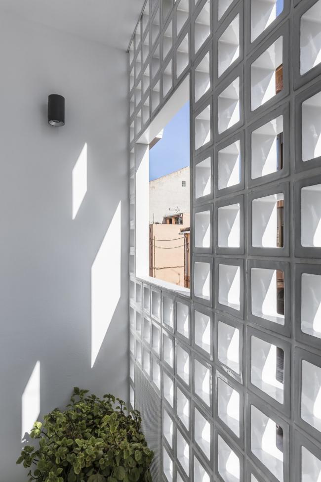 该项目中最后一个需要强调的概念是它的主立面。这是唯一一个面对公共街道的立面,通过类似皮肤一样的网状结构来解决,向卡斯特伦( Castellón )省的陶瓷传统致敬。有了它,我们设法将房屋的所有楼层都整合在一起,在内部提供私密性并保护了朝南的房间,参与到房屋的光线游戏当中来。