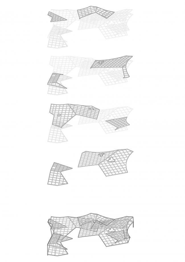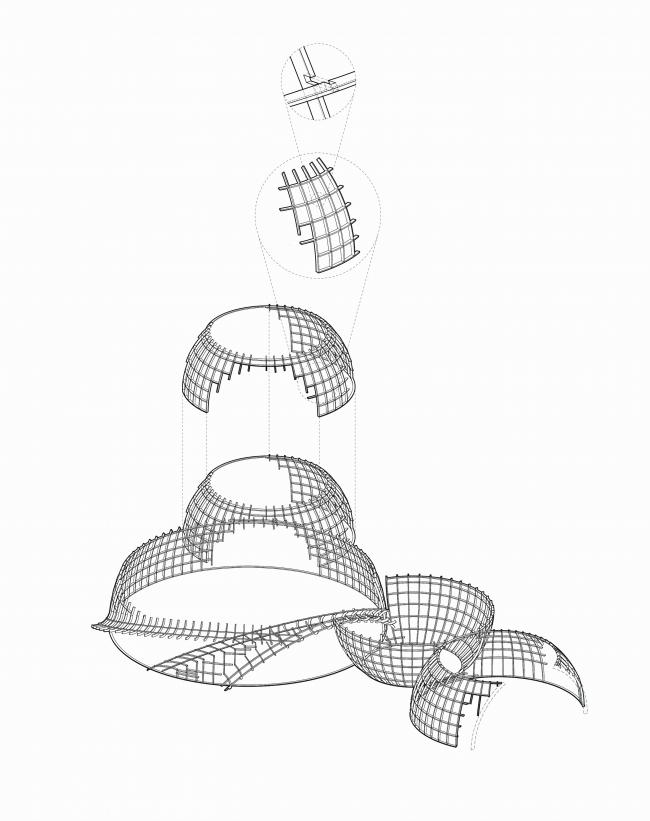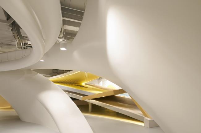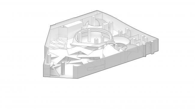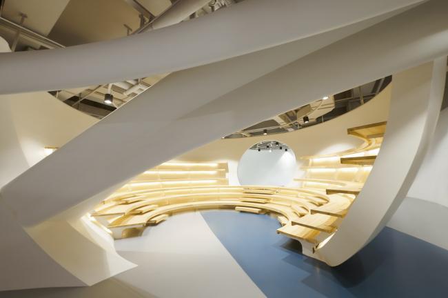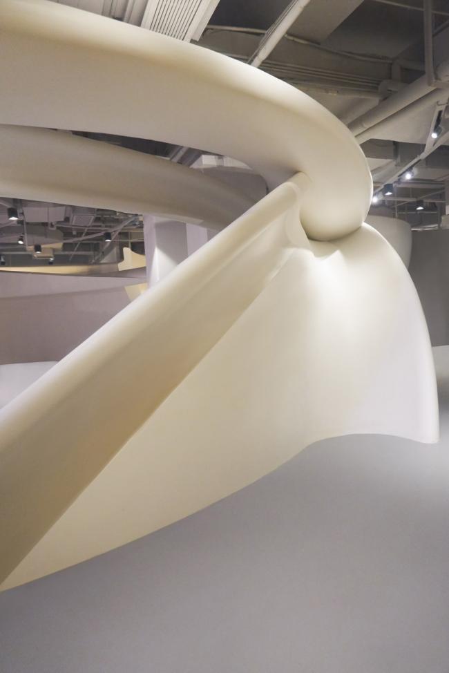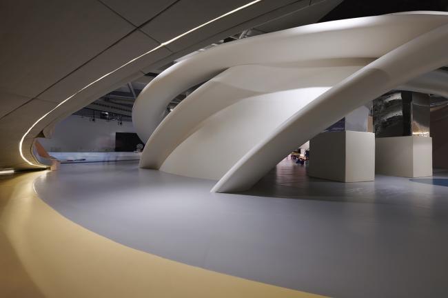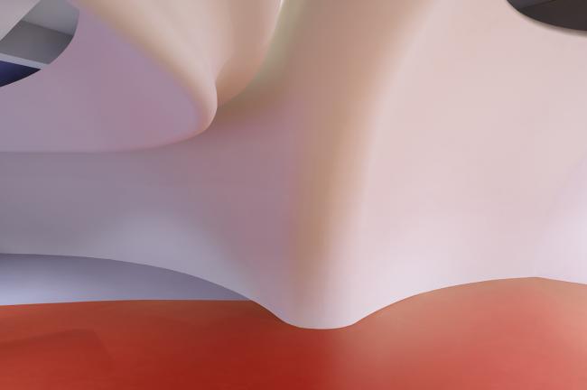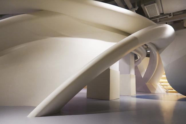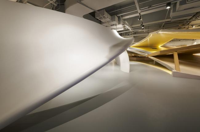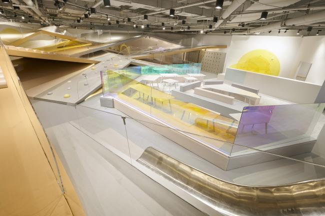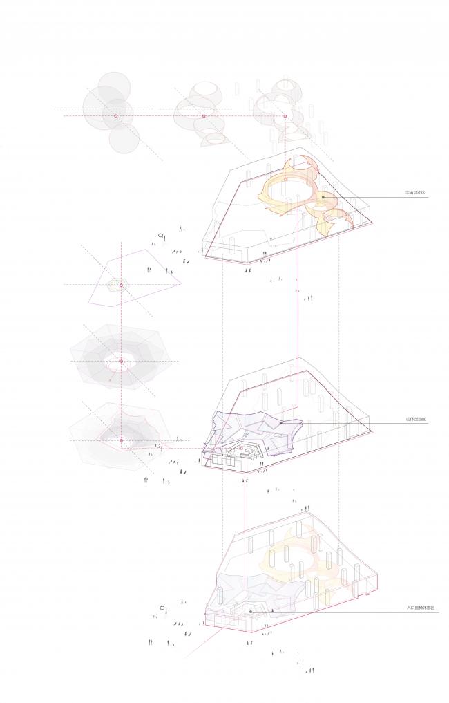 之后,SpActrum开始了对于设计语言的探索。我们认为整体形式应该具有宇源的启发性。高速高能量是宇宙的日常,但整个宇宙却又仿佛静止一般。我们想表达的正是这种静止中蕴藏的极速运动,所以我们回归到最基本的球体。同时,平面经过多向度的移动,演化成一系列可以行走、攀爬的斜面,保留对于地球地形的记忆。最终,空间被分为了两个部分,球体演化而来的“宇宙”和斜面堆叠形成的“山”。