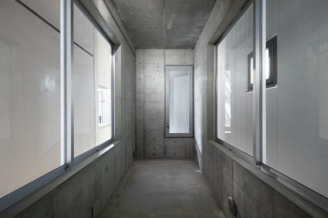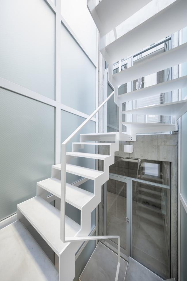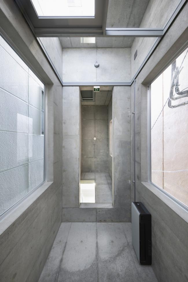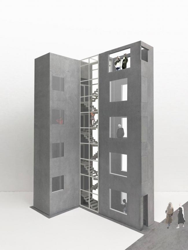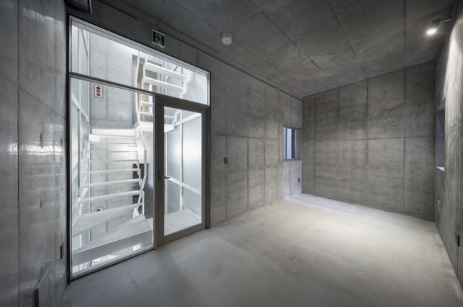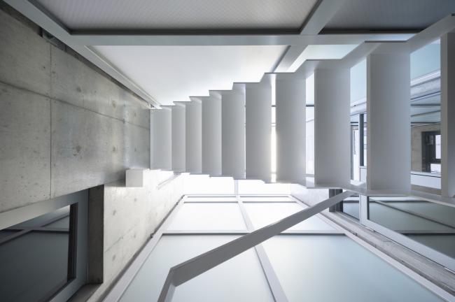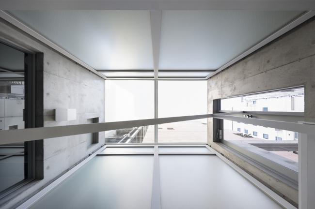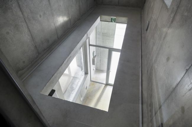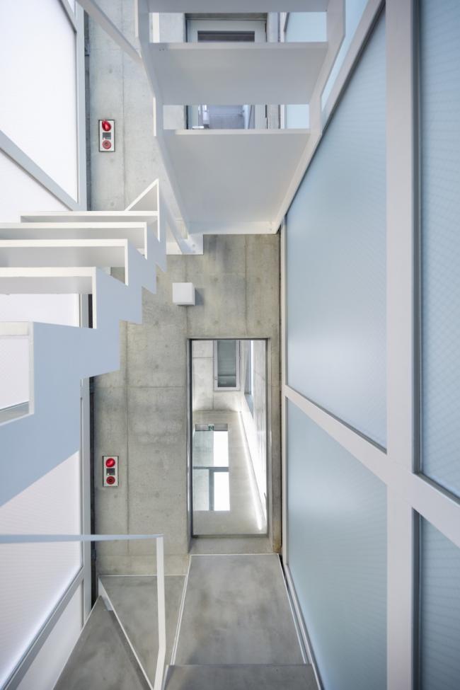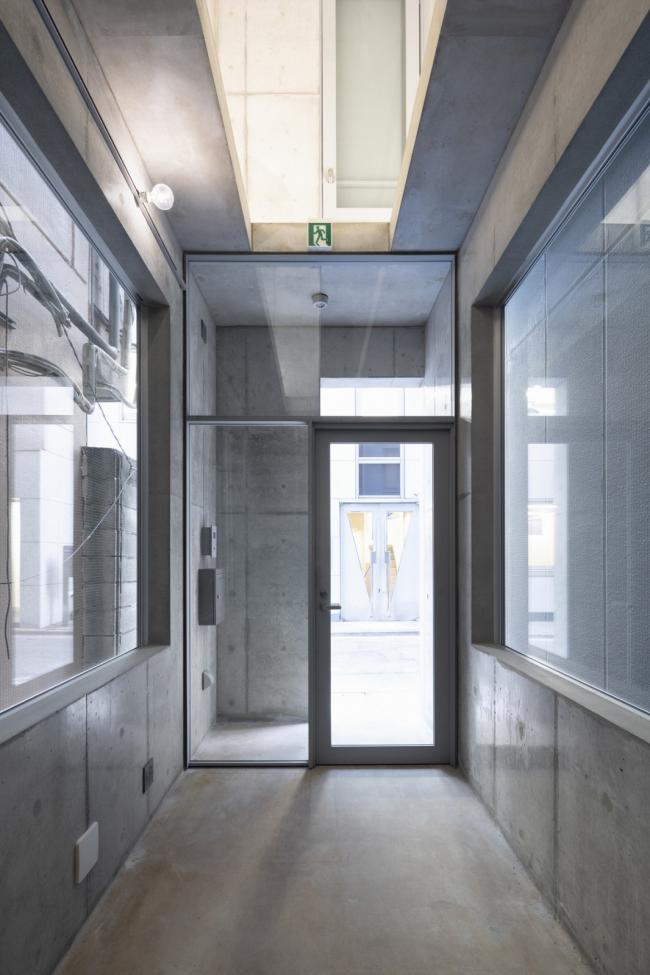 在设计早期我们就放弃了钢铁结构,选择了清水混凝土。原因是场地中不耐用的地面状况和难以实现“L”型建筑形态。由于地基受到限制,建筑必须尽可能轻盈。因而我们将墙体开口开得尽可能大,使它们均匀地分散墙体的承重。这些狭窄入口大厅处的大开口使人们进一步感受到了小巷中的空间感。钢筋与玻璃制成的楼梯如同两个水泥建筑间延伸的关节,使它们在结构上相互独立。