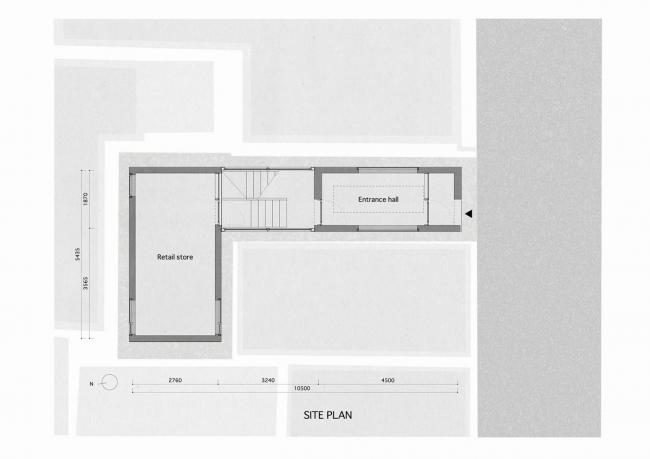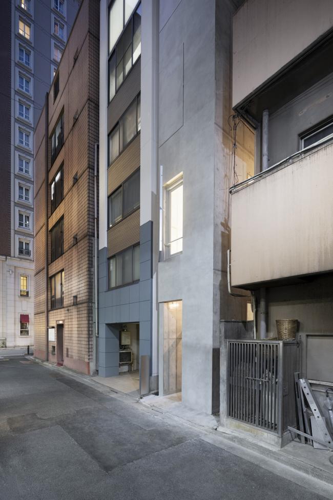 建筑位于一个靠近银座主干道之一的无名小巷,这片区域在项目开始之前已经荒废了三年。场地的前部离(BIM建筑)街道只有2.7米,周围的高建筑物像墙一样包围着它的边界,如果你从场地内部向上看,你会看到一个完美的“L”型天空。这个特别的选址以及它狭窄的形状让我们想到从一个小巷走到另一个小巷的灵感。这种感受以及自然光的重要性引导了本项目的设计。