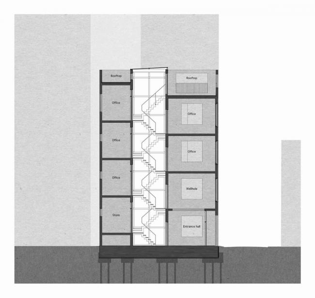 在这些非常受限的情况下,我们试着尽可能最大化建筑的占地面积以及高度。建筑被分为两部分,后方的更大,在前面连接小巷的单薄一些。这中间有一个紧凑的玻璃楼梯灵巧地连结着高度不同两部分。它如同一个所有房间都可以看到的自然发光中心体,并且可以当作不同用户的展区,或者鉴于其独立性,可以当作一整个展览区域。