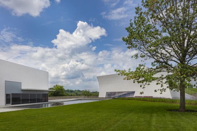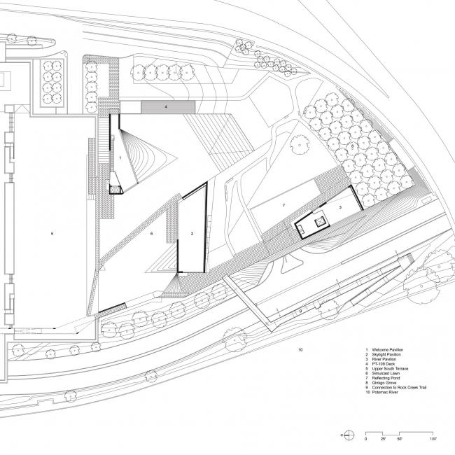 扩建项目在室外景观上对肯尼迪总统的一生做了一定的隐喻设计。一个由35棵银杏树所组成的小树林,以象征其所就任的是美国第35任总统,小树林会在11月末飘落秋季的黄叶。而景观池甲板所运用的桃花心木材则取自肯尼迪总统在第二次世界大战时指挥的PT109号鱼雷快艇中甲板木的材质和尺寸。
