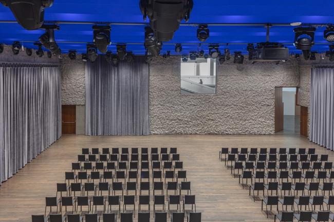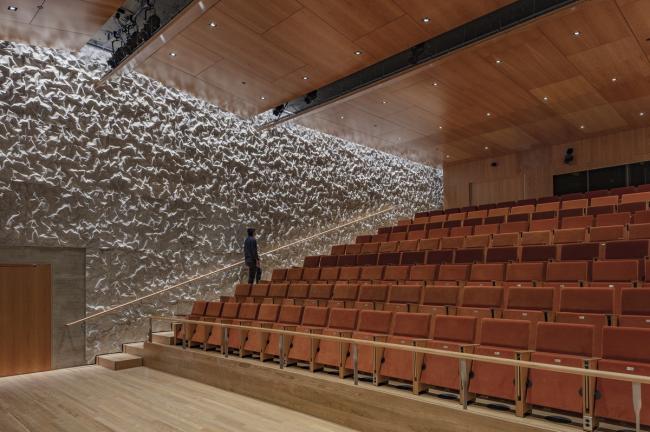 虽然这三个新建的构筑物形态各异,似乎无法用特定的几何关系去描述它们,但建筑师在其表面设计了一定的几何关系,以建立三者间的联系。具体来说,建筑师从三个构筑物的形态语言入手,利用了包括圆锥曲面和双曲抛物面在内的几何元素。相呼应的内凹曲线,将构筑物从视觉上串联在一起,从而使建筑师得以在内部置入相应的空间。而在扩建中心彩排表演区的墙面设计上,建筑师运用了一种最新研发的纹状混凝土肌理,以同步实现室内声学设计与混凝土墙浇筑的建造需求。