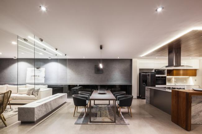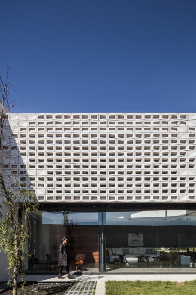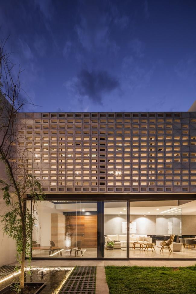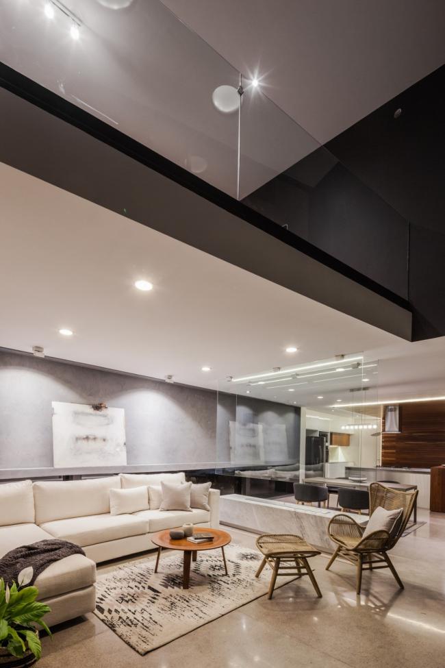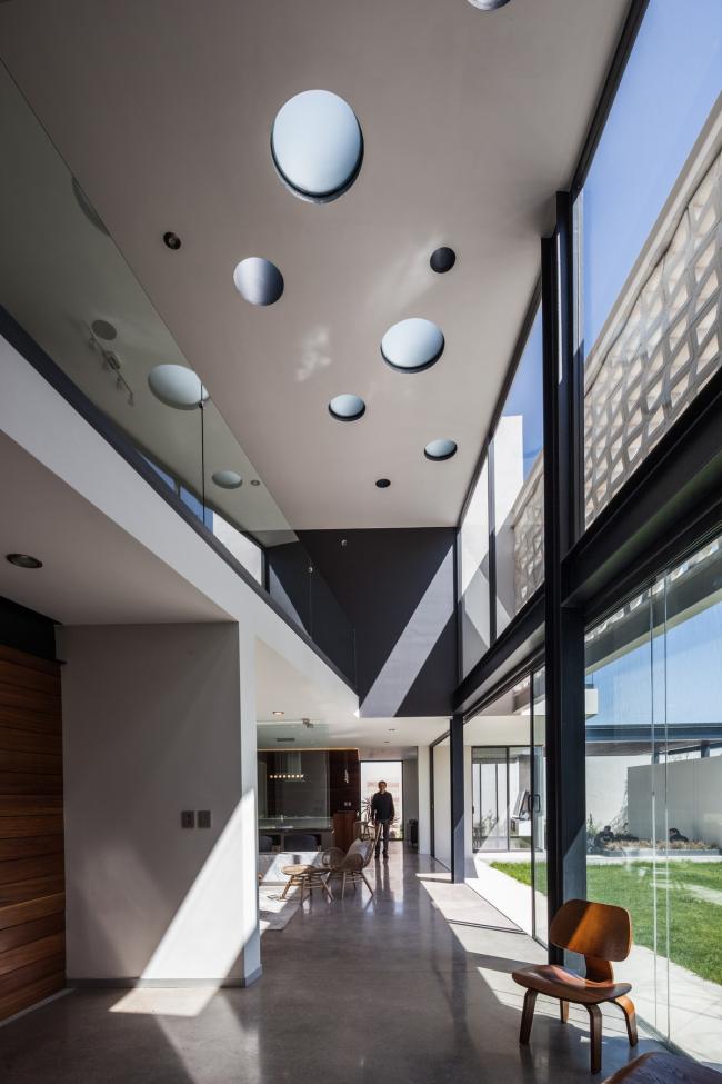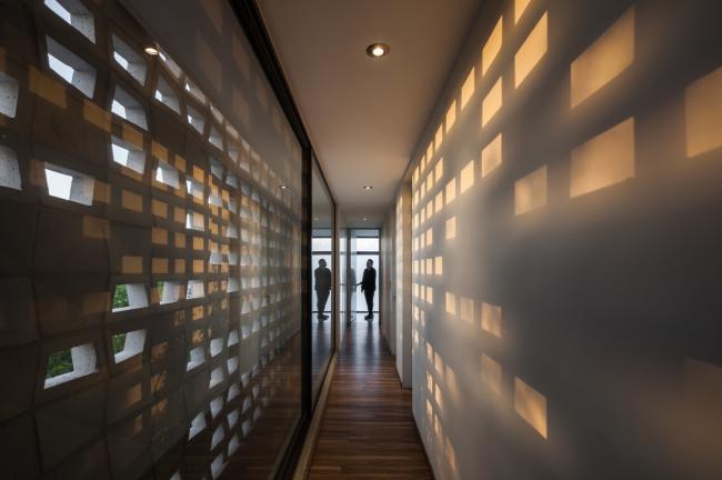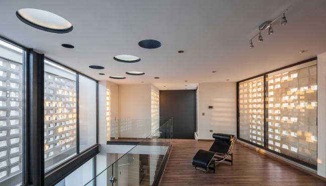 空间中的人造光源无疑是各个空间的核心要点,它们为在空间中设计不同环境提供了可能。LED灯的使用是一个节能方案,出于同样的理由,目前所有空间中的自然光也都是直接的,可控的,功能性的。一种特殊模数的格栅在现场被制造出来,使得室内得以观赏日落的景观并且控制西立面内部的太阳角度。更深一步来说,它形成了帆布网状光线,灵巧地穿透了房屋中的动态空间。