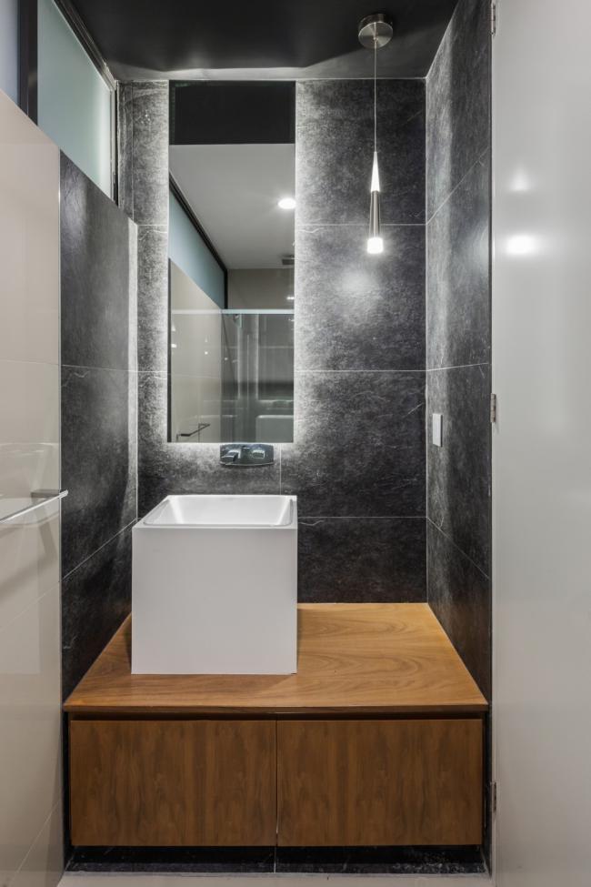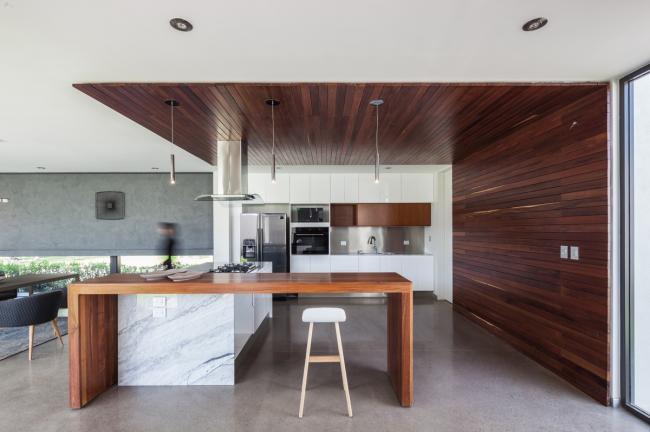 楼层被分为三个部分,社交区,私人区和功能区。首层统一了所有社交空间,以抛光的混凝土地板收尾,进行了激光水平校准和磨光过程,使整体统一,让其得以被认为是一整块石料。在从外部转移到内部保护空间的过程中,包含了卧室和家庭房间的二层是一个薄木楼层,目的是创造温暖和私密性,而在互补和功能空间中,陶瓷板的巧妙组合体致力于创造潮湿空间的实用性以及材质的和谐性,从而产生空间感。