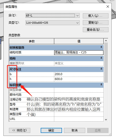 *不同模型的梁族对高度和宽度的命名各有不同,故需要自行输入梁高、梁宽命名