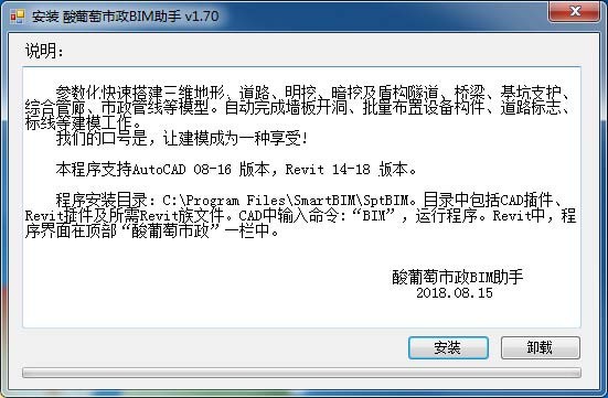 双击“安装.exe”,弹出“安装 酸葡萄市政BIM助手 v1.70”窗口,点击“安装”按钮即可安装。