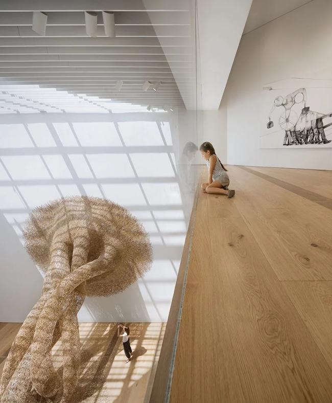 博物馆分为三层,一层是相对大的展览空间,与周围城市景观的节奏和比例相呼应,上层是较小的空间,用于展示小规模的艺术作品。建筑中央的中庭在引入充足的自然光线的同时,建立了不同楼层的联系。建筑在视觉上呈现的最大亮点包括,迄今为止最大的由竹艺术家Tanabe Chikuunsai IV打造的装置,以及两件由棉花糖激光盛宴制作的数字艺术作品。