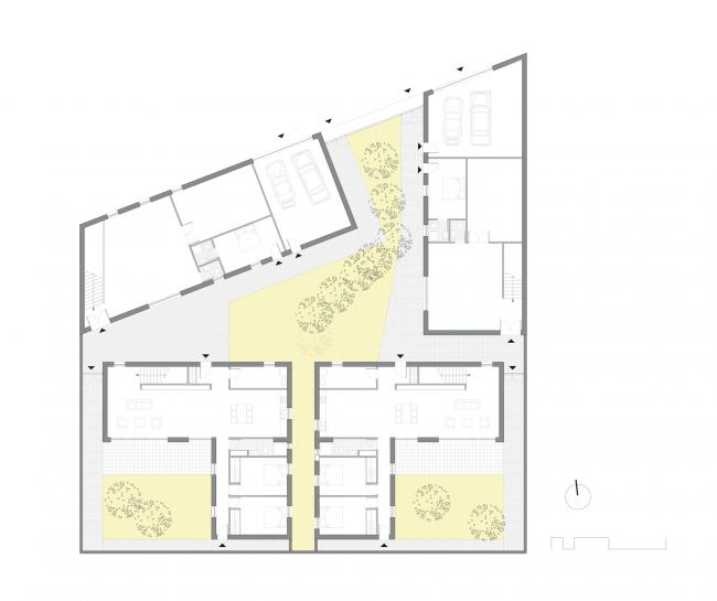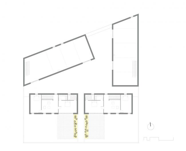 后者从时间与空间上同时提供了一种相互连接与隔离的选择。由于一个给定的地块必须能满足两位业主的不同需求,对于设计来说,发挥决定性作用的就是和平共存的问题,即个体表达与集体共享空间体验之间的问题。适宜的建筑原型的有效形体一方面迎合了这种隐私度与个性化的共存,还(BIM工作)满足了集体使用需求与宣传效果,其方式是提供隐私性逐层递减的户外空间,也就是从私人的空间一直过渡为共享的公共空间。
