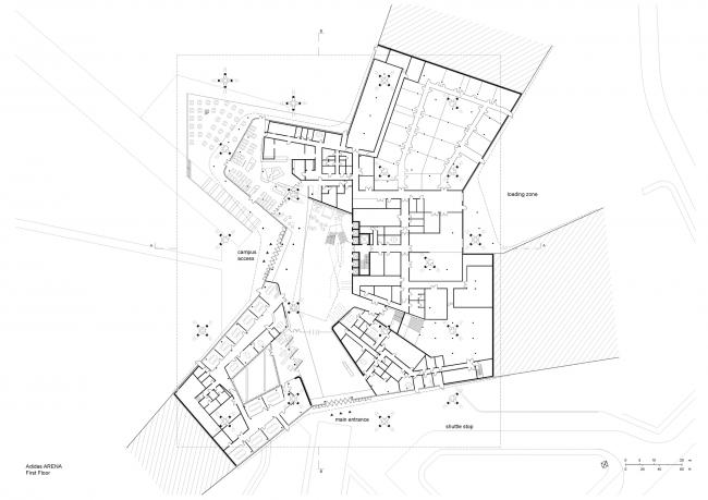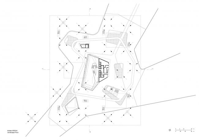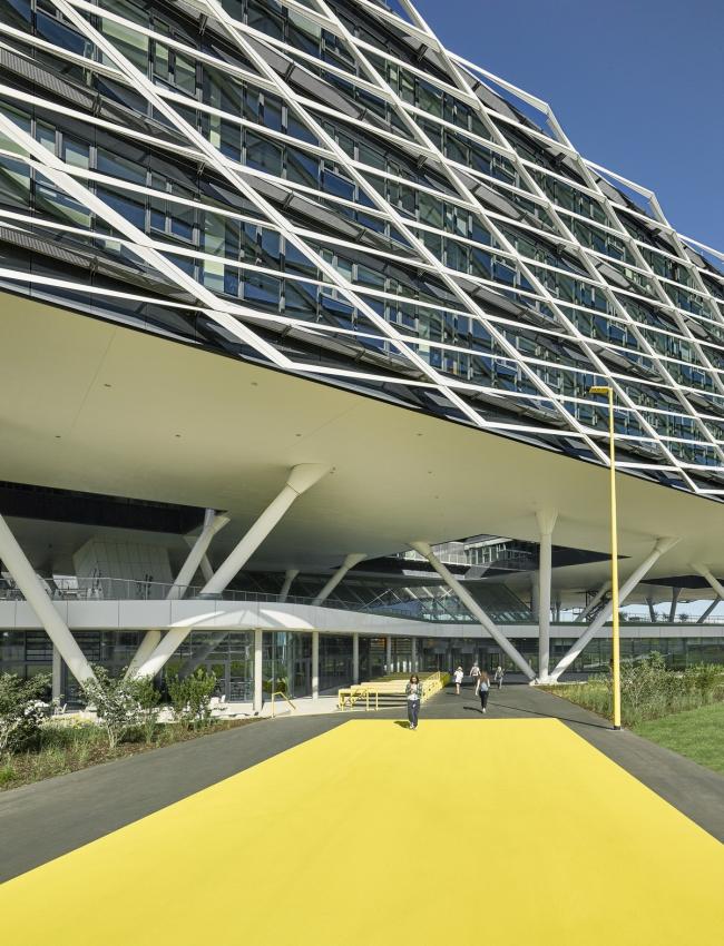 建筑师以工作社交与品牌自身对未来发展的责任为概念基础,试图在通透空间、室外景观和现代办公理念间寻求最佳的平衡点。因而,建筑师将整个抽象的外形体块直接架空在人造绿地景观之上,营造了一个引人注目的办公大楼。办公楼共分三层,大楼入口则藏于人造山丘之间。而其中一部分入口面向公众开放,并与一个宽敞明亮的中庭直接相连,以提供各类活动所需。